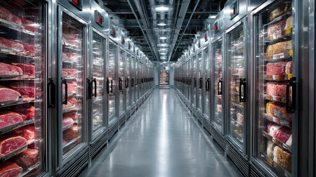 A spacious and organized meat freezer aisle in a modern supermarket facility, showcasing various meats in transparent displays for easy shopping.
