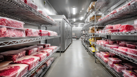 Storage Facility for Perishable Goods Features Organized Meat Inventory in Climate Controlled Refrigeration Area Generative AI