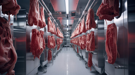 Cinematic view of a professional butcher facility interior, showcasing fresh meat cuts hanging in cold storage. Industrial lighting and metal surfaces enhance the atmosphere.