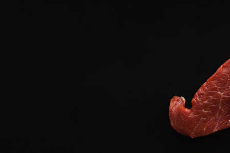 Fresh raw beef steak, meat on a black background, close up, copy space.