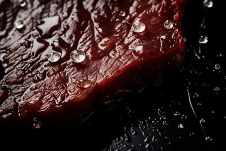 Raw beef steak with water drops on a black background. Toned.