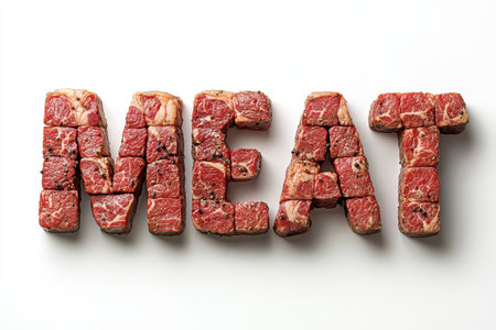 The meat word is creatively formed using neatly arranged slabs of beef. This artwork showcases the texture and vibrant color of fresh meat pieces, emphasizing culinary artistry.