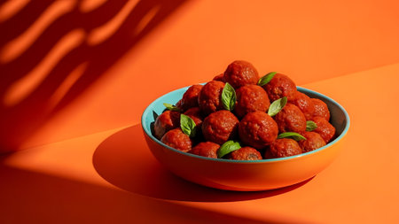 A bowl of savory meatballs with fresh green basil leaves on top, casting a shadow.