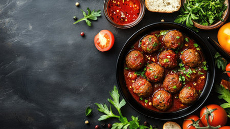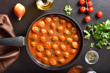 Meatballs with tomato sauce in frying pan over dark stone background. Top view, flat lay