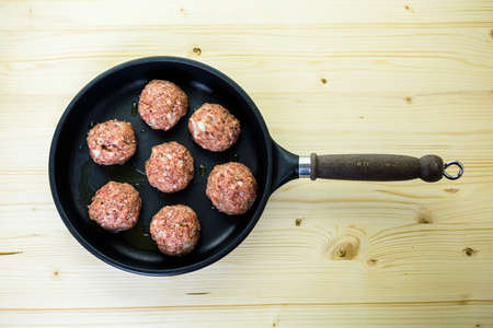 Traditional swedish meatballs in a fried pan with creamy sauce on old wooden table top view copy space for text