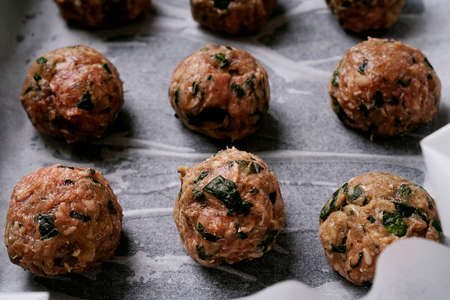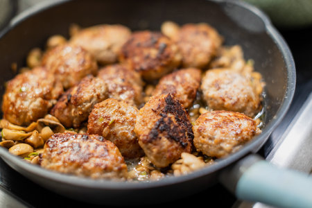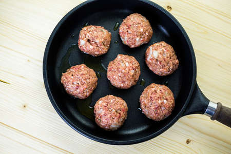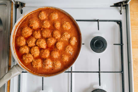 Meatballs cooking process in a pan at home. Beef, chicken and pork meat food recipe in tomato sauce