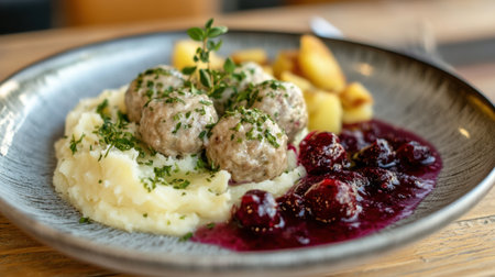 A tempting platter featuring Swedish meatballs on creamy mashed potatoes with a side of lingonberry sauce and roasted potatoes, perfect for food lovers.