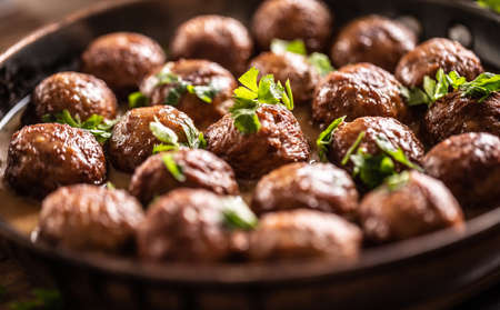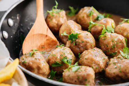 Detail of Swedish meatballs, kottbullar, in a pan topped with fresh parsley.