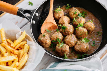 Meatballs in onion sauce with parsley in a frying pan and fries. Close up