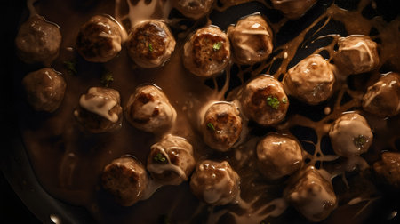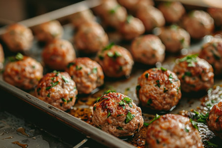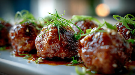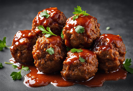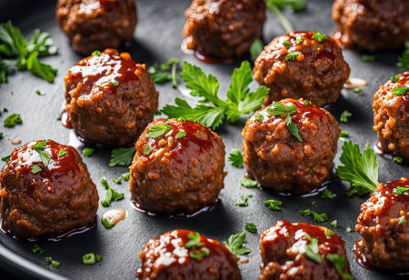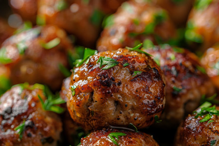Detailed macro shot of savory meatballs glazed with herbs, highlighting their juicy texture, rich flavor, and appealing presentation.