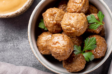 Traditional swedish meatballs with creamy sauce on gray background top view close up