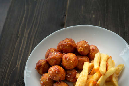 Spicy coated meatballs with spicy sauce served with fried potatoe fries. Korean style snacking.