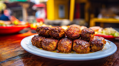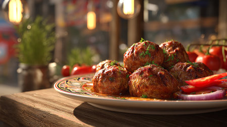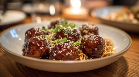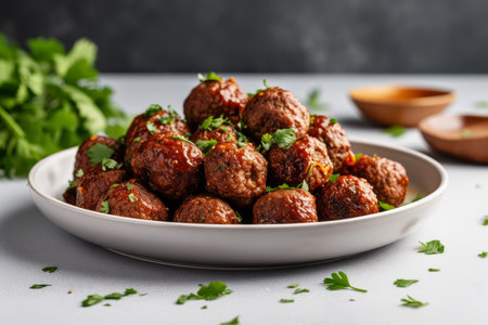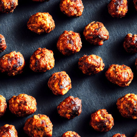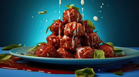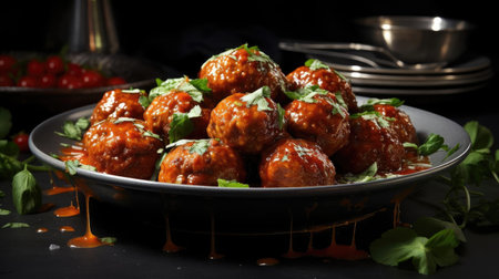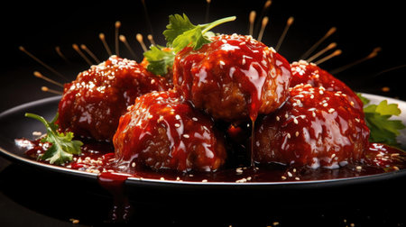 AI Generated. Culinary delight delicious chicken meatballs with spicy sauce in bright lighting