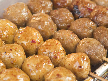 Meatballs on sticks, dipped in sweet chili sauce at a market in Thailand