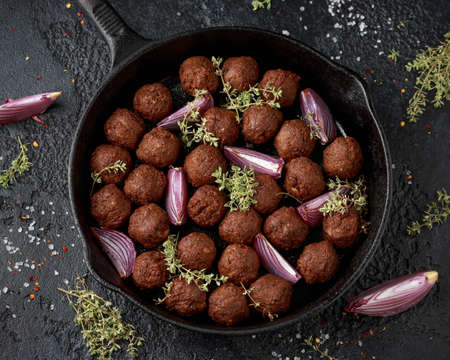 Thyme and onion vegetarian vegan meatballs oven baked in cast iron skillet frying pan
