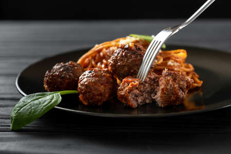 Spaghetti with meatballs, tomato sauce and parsley, closeup