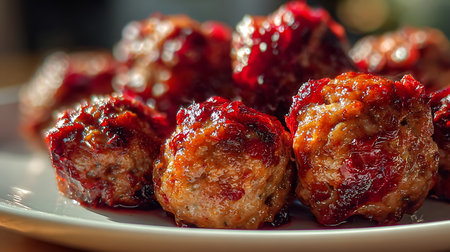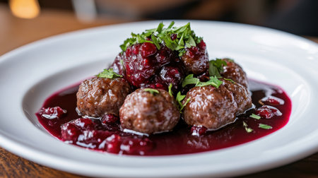 Meatballs with cranberry sauce on a white plate. Selective focus.