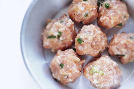 Ready to cook meatballs in asian bamboo steamer over a metal background. Top View. Flat Lay.