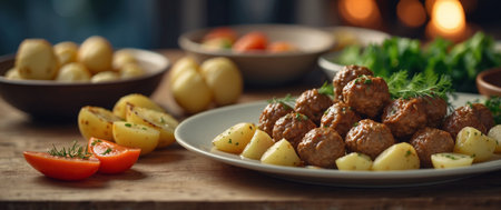 AI Generated. Cooked meatballs in dill sauce with boiled potatoes and fresh vegetables on wooden table