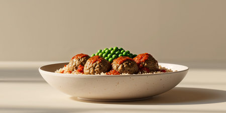 AI Generated. Hearty Meatball Rice Dish with Tomato Sauce and Peas
