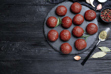 Many fresh raw meatballs on black wooden table, flat lay. Space for text