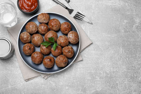 Tasty cooked meatballs with parsley served on light gray table, flat lay, Space for text
