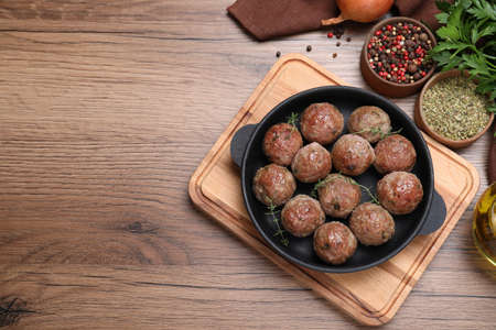 Tasty cooked meatballs on wooden table, flat lay, Space for text