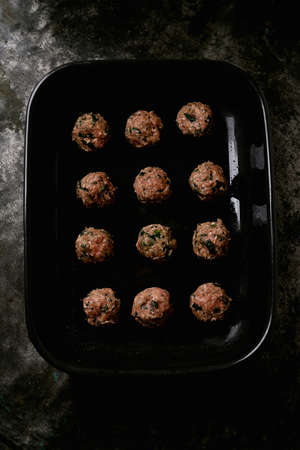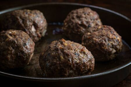 Large Italian meatballs in baking pan on rustic moody wooden table