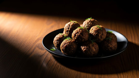 Lentil and mushroom meatballs vegetarian meal on dark background. Generative AI art