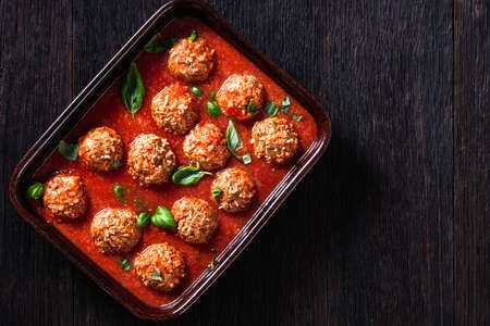 Italian Porcupine Balls, ground beef and rice meatballs in tomato sauce in rustic baking dish on dark wooden table, horizontal view from above, flat lay, free space