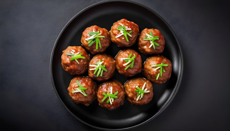 chinese soy meatballs on a black plate. Garnish. View from above. Chinese cuisine, hotpot ingredient