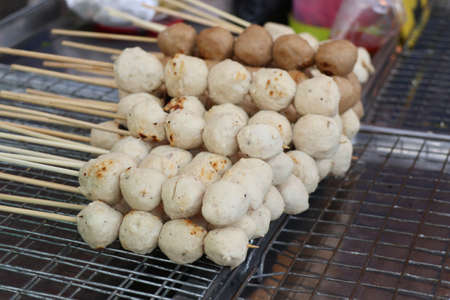 Cooking Barbecue Meatball Satay in grilling stove. This is Indonesian Traditional Street Food made from meatball.