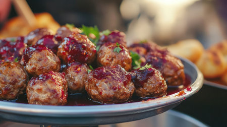 A close-up shot of traditional Swedish meatballs served with lingonberry sauce on a street vendor plate, highlighting their rich color and texture.