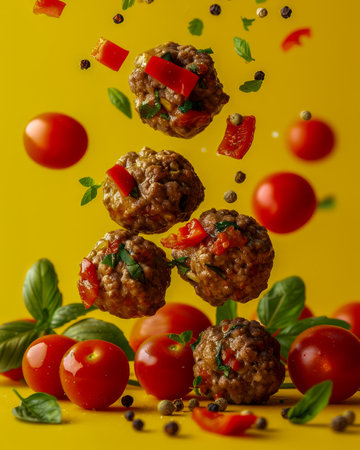 Fresh Homemade Meatballs with Cherry Tomatoes, Basil, and Spices in Mid Air on Vibrant Yellow Background AI Generative