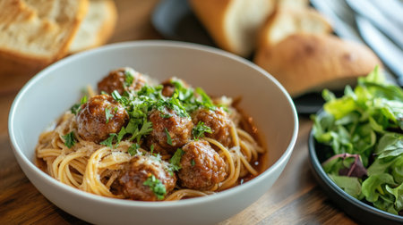 A vibrant bowl of spaghetti and meatballs topped with fresh herbs, served with a side of salad and crusty bread. Perfect for a home-cooked meal.