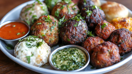 A vibrant platter of assorted meatballs accompanied by colorful dipping sauces and fresh herbs, perfect for gatherings and dining experiences.