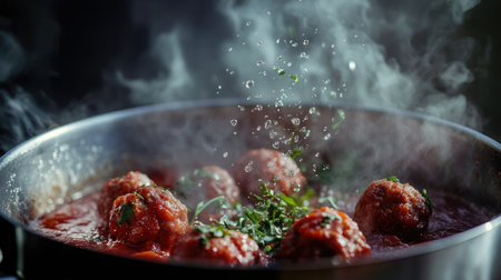 A creative shot of meatballs being dropped into a simmering pot of sauce, with steam rising and herbs floating, capturing the essence of home-cooked comfort food