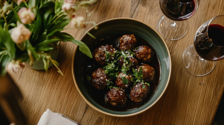A delightful dish of meatballs nestled in a savory sauce, beautifully garnished and paired with red wine, creating a cozy dining atmosphere on rustic wood.