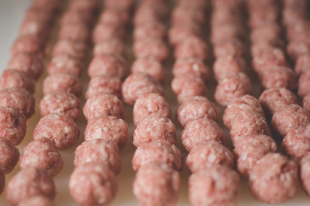 View into the oven on the baking tray for meatballs. Little light, light only from the oven. Shallow depth of field, blurred background.