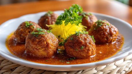 Savory meatballs arranged on a plate, richly coated in a flavorful sauce, complemented with fresh herbs and bright yellow garnish for an inviting presentation.