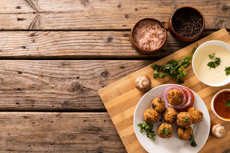 Directly above view of fresh meatballs with seasoning bowls on cutting board over wooden table. unaltered, organic food and healthy eating concept.
