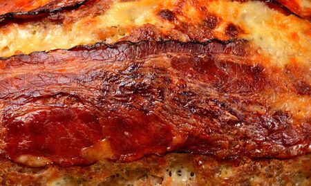 Close-up of a slice of homemade meatloaf with a crispy bacon wrapping and a drizzle of tangy BBQ sauce, AI Generated