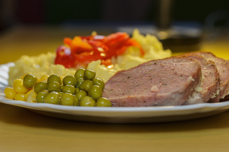 Lentil meatloaf pieces with mashed potatoes and green peas on a gray plate, top view. Vegan christmas recipe.