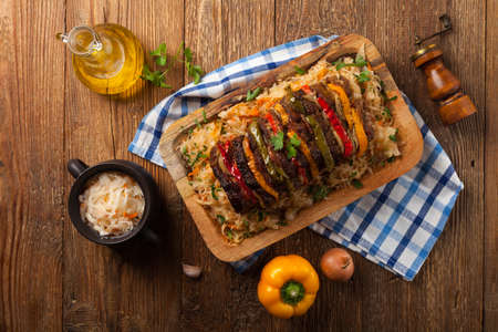 Delicious fresh ground beef meat roll with cheese, tomatoes and sweet peppers baked with spices and herbs. Making Food for a family dinner