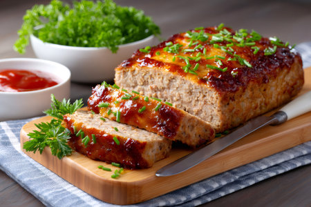 Delicious homemade meatloaf garnished with chives and parsley, served on a wooden cutting board with ketchup