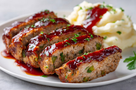 Slices of homemade meatloaf topped with a rich ketchup glaze and fresh parsley, served with mashed potatoes