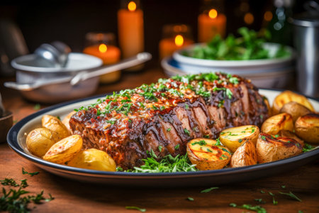 A succulent roasted meat dish, perfectly prepared with herbs and spices, served with golden potatoes on a rustic table setting, inviting a gourmet experience.