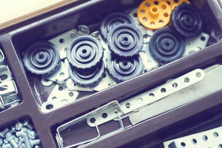Metal parts and elements of the children's building kit lying in the box. Concept of development of engineering and inventive thinking in children.