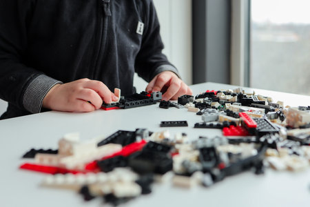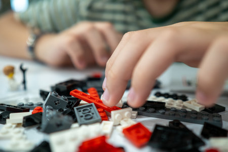 Moscow, The Russia - September 24, 2019: Children hands play with lego blocks