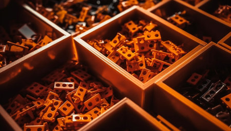 pile of plastic building blocks on brown paper background